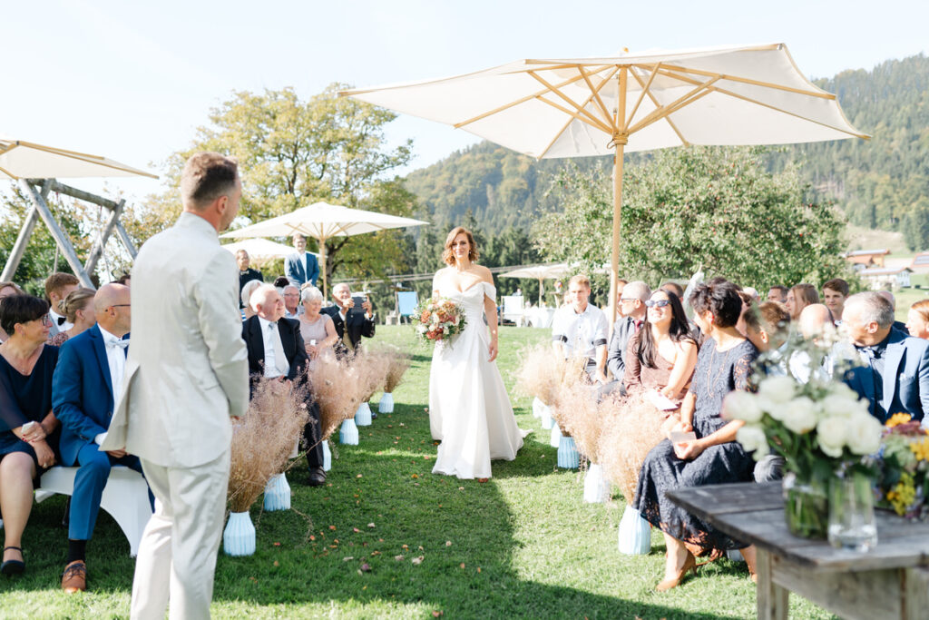 - Freie Trauung im Garten, umgeben von grünen Wiesen und mit Blick auf die Berge.